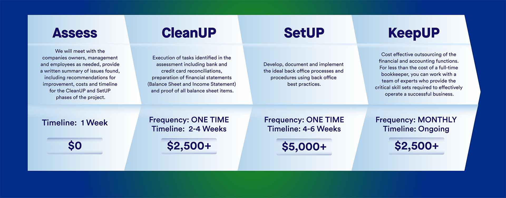 Cost effective outsourcing of the financial and accounting functions. For less than the cost of a full-time bookkeeper, you can work with a team of experts who provide the critical skill sets required to effectively operate a successful business.
